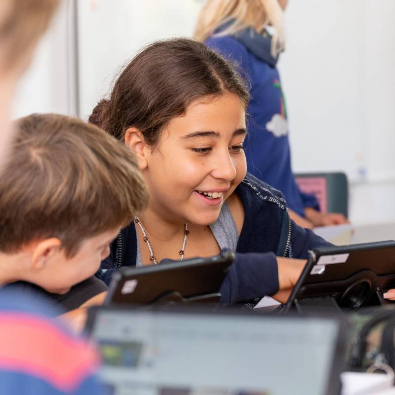 Digitales Lernen und Arbeiten ist ein fester Bestandteil in unserem Schulalltag. Wir möchten die Kinder und Jugendlichen befähigen, die Werkzeuge und Regeln der digitalen Welt zu nutzen, ebenso wie ihre Inhalte kritisch zu hinterfragen und eigene, begründete Urteile machen zu können. Allen Schüler*innen stehen Tablets bzw. Laptops zur Verfügung. Zusätzlich sind alle Klassenräume mit Whiteboards oder interaktiven Tafeln ausgestattet. Die gesamte Schule ist flächendeckend mit WLAN versorgt.